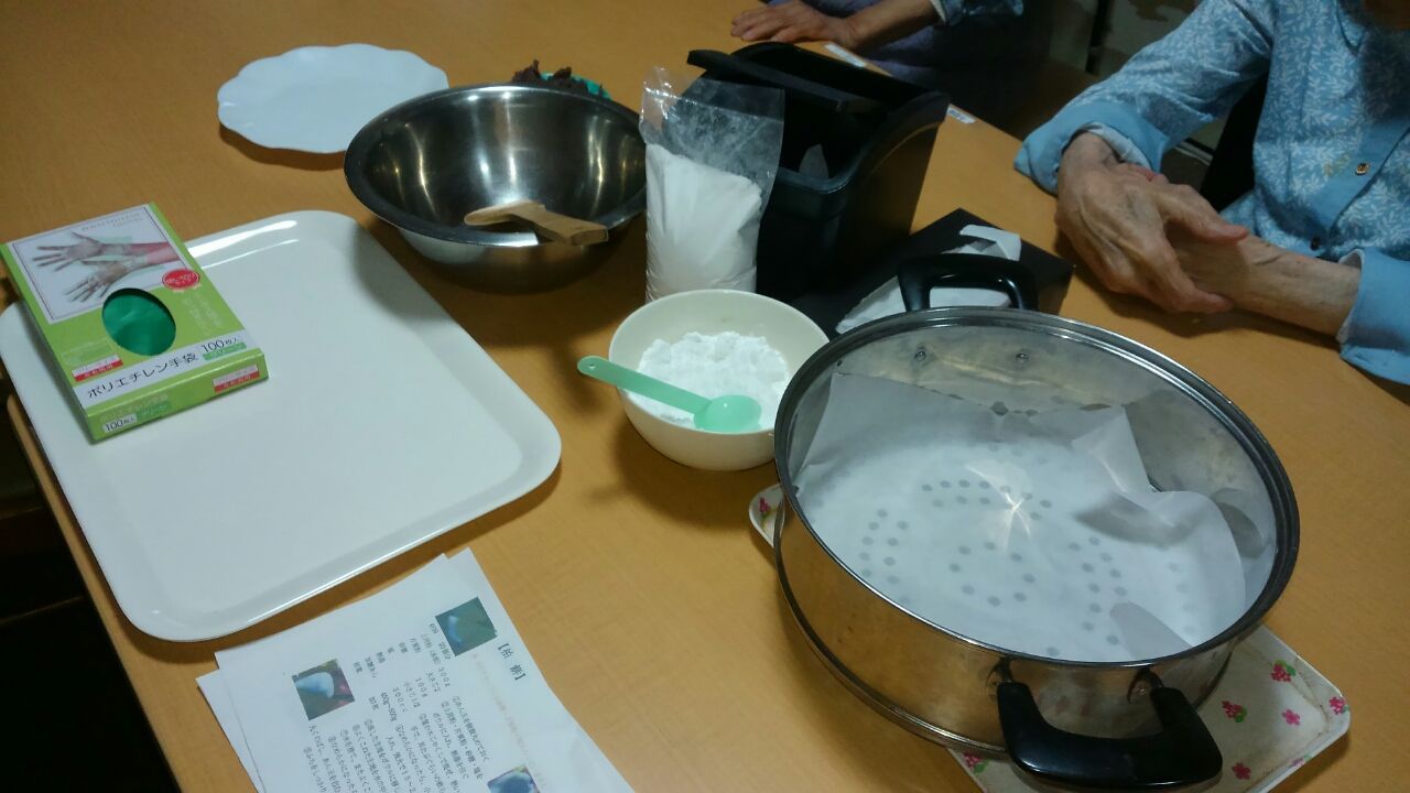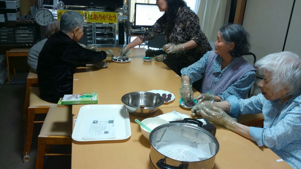 柏餅づくり 2017.05.05 11:23 柏餅を作りました。 餡を丸めてもらいました。 おもちは、粉、砂糖、塩を混ぜ たのを蒸しておきました。 おもちを丸めたのを伸ばして餡 を入れて柏に包んでもらいました。 餡が、大きくておもちにはみ出し そうでしたが。柏で隠れて大丈夫 でした。おやつに皆さんで食べました。 待ち時間にコブレットをしました 今回は、少し慣れてきたのか聞く 方もいませんでした。それでも うっかり2列そろっていても違う ところにおいたり勘違いがありまし たが、少したったらわかったよう でした。