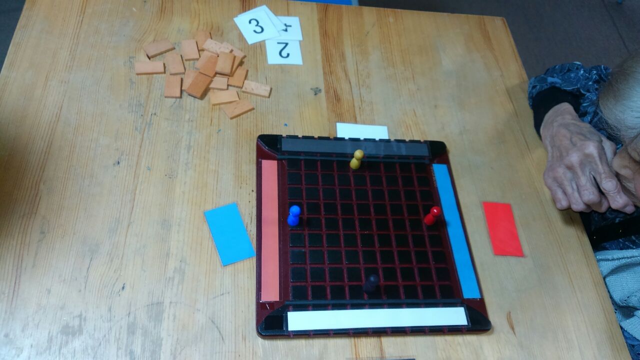 コリドール 2017.05.09 11:14 陣地取りゲームで、コリドールをしました。 自分の前におけたら勝ちです。 最初サイコロで、白は、縦か横 ひとつ進めて、赤は、板をおいて 相手を邪魔することができます。 ただ前に進むだけでなかなか 板をおく場面が、ありませんでした が、板をおかれると遠回りになった りとなかなかゴールにつかないよう でした。