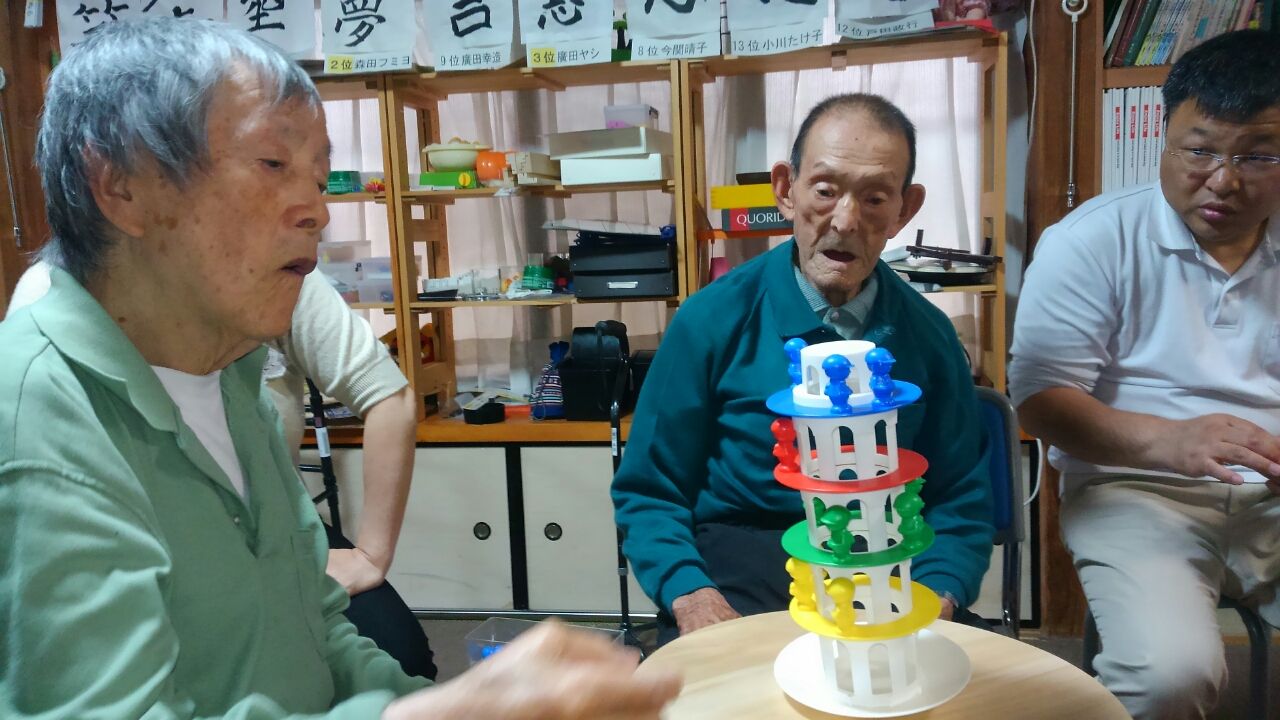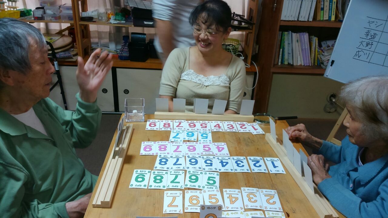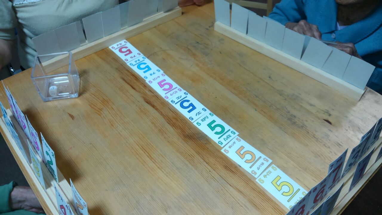 7色5ならべ 2017.05.16 11:14 7色5ならべをしました。 サイコロをふって1、2、3枚のトランプ を出します。パスをすると出せない枚数 を多い人からもらいます。 職員を入れて4人で行いました。 トランプの枚数が多く自分のトランプ と並んでいるトランプを見て一生懸命 探していました。そんなに時間もかかる ことなくスムーズに行っていました。 もうひとりの方が加わりグラグラゲーム をやりました。バランスをとるので皆さん 慎重に行っていました。皆さん上手でたく さん載せることが出来ましました。