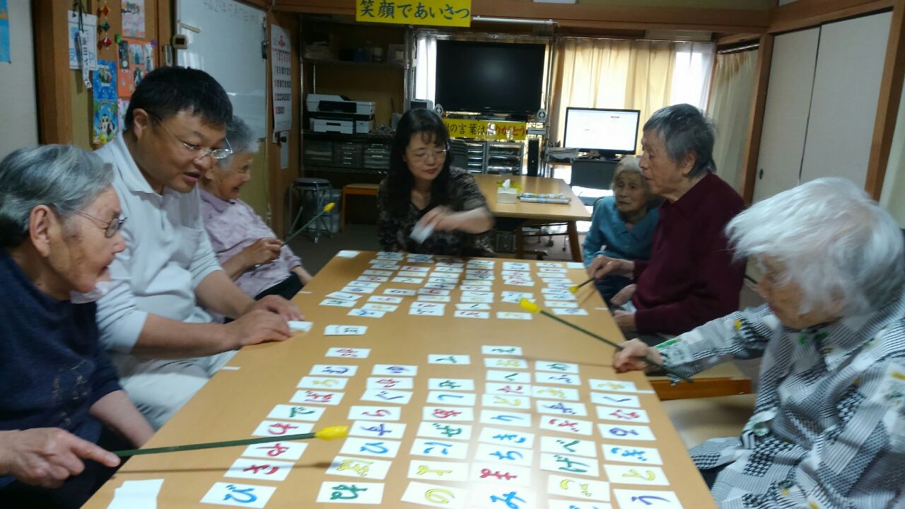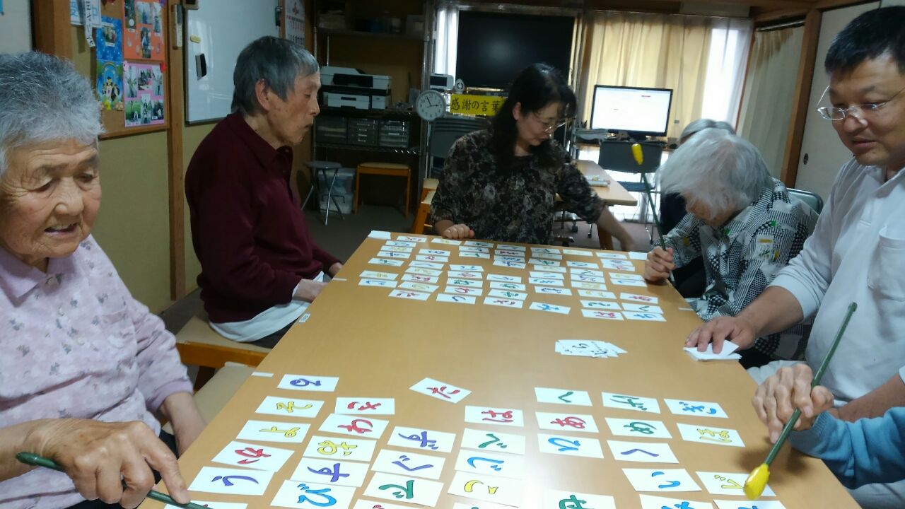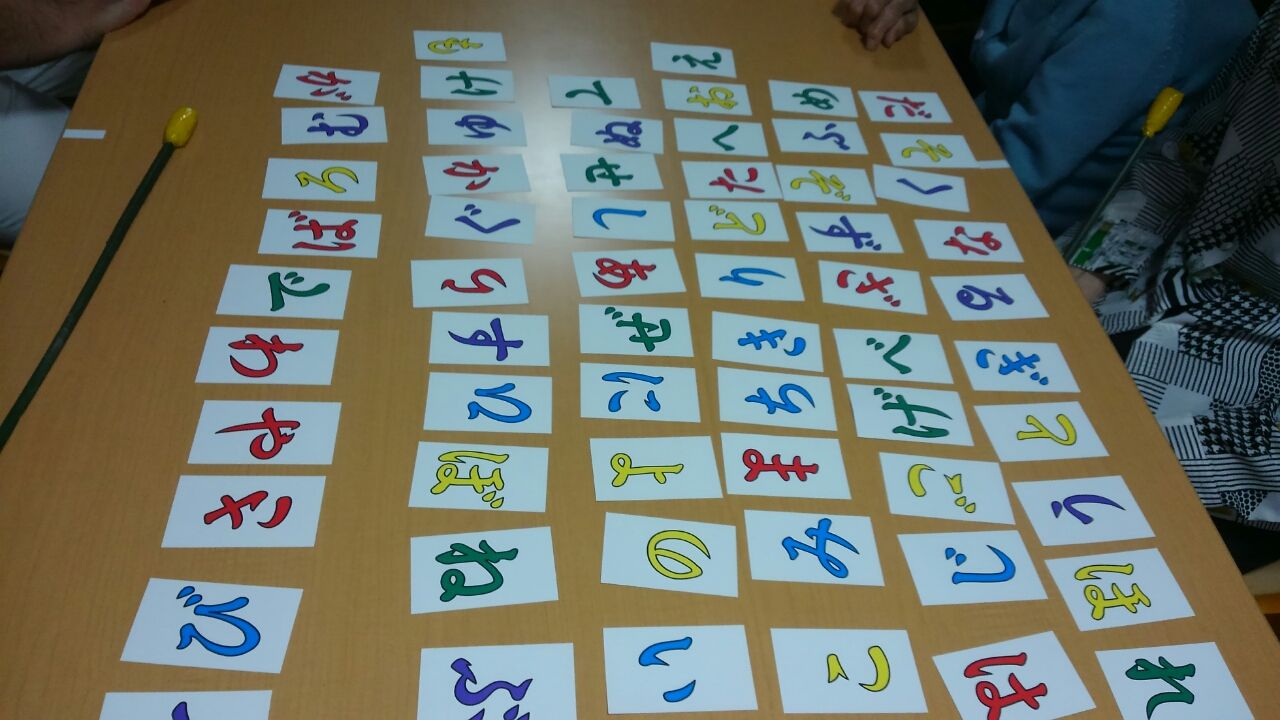 かるた 2017.05.17 11:20 スピードレクレーションで、かるた取りです。 64枚の札を30枚読み二人一組で、 もう一組加わり同時進行で、行いました。 皆さん手際わよくみつかると、遠い札は、 長い棒を使い、近くにあると手で、タッチ してすぐみつけることが出来ました。 ちょっとの棒の使い方で、取りそびれる 場合があります。 奥に映っている方は、勝ち残った方 です。