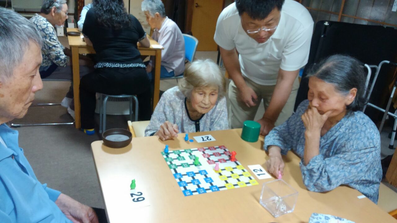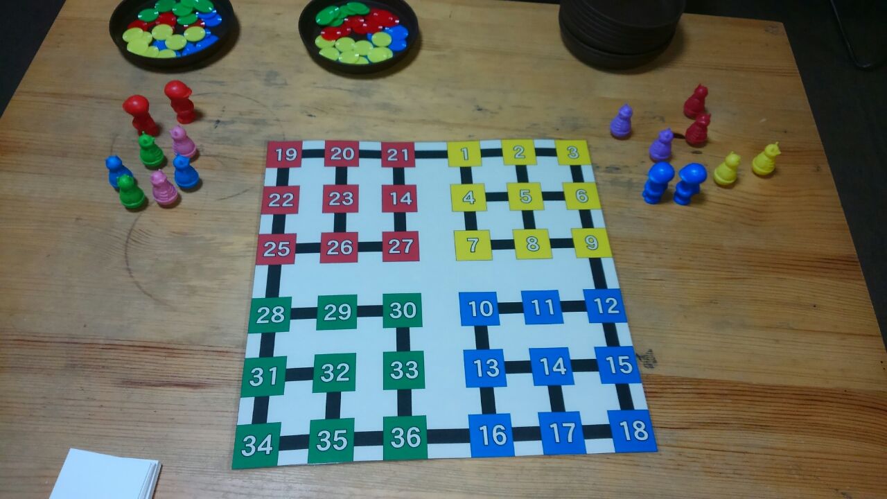 色合わせ 2017.05.24 11:11 色合わせをしました。 8づつの数字が黄、青、赤、緑と4色 の道を番号札に合わせてふたつのサイコロ でひとつ決めて進みます4色そろったら 勝ちです。 コマで進む時斜めにいったり線を 越えたり最初のうちは、ありましたが 線に添って進むことが出来ましました。 他に初めの1歩が、ちょっととまどって いました