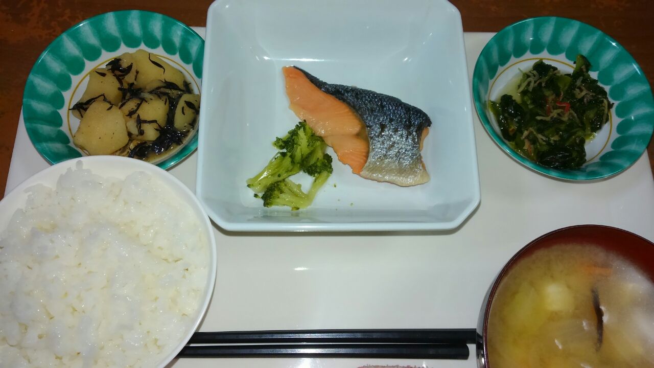本日のメニュー 2017.05.26 11:18 本日のメニューです(5月26日) 昼食 主食 ごはん 味噌汁 主菜 秋鮭塩焼き 副菜 ジャガイモのひじき煮 チンゲン菜のかにかま和え 添え物 ブロッコリー夕食 主食 ごはん 味噌汁主菜 鶏肉と厚揚げのみぞれ煮副菜 焼売 小松菜のしらす和え