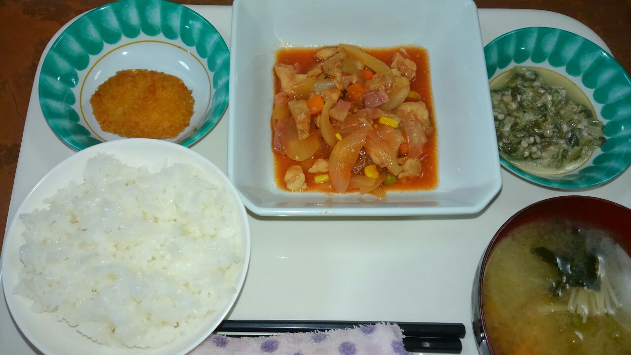本日のメニューです 2017.05.29 11:13 本日のメニューです(5月29日) 昼食 主食 ごはん 味噌汁 主菜 チキンのトマト煮込み 副菜 カレーコロッケ 添え物 オクラのゴマ和え夕食 主食 ごはん 味噌汁主菜 さば山椒焼き副菜 厚揚げと小松菜の生姜煮 れんこんマリネ