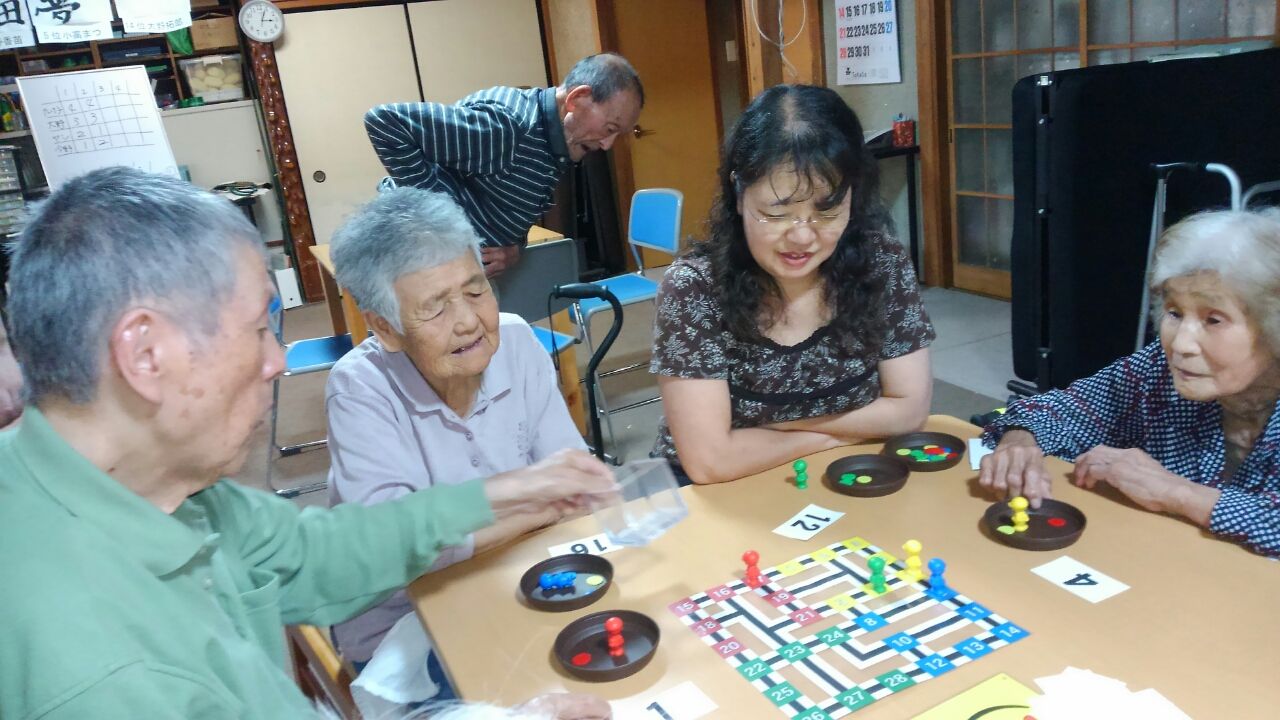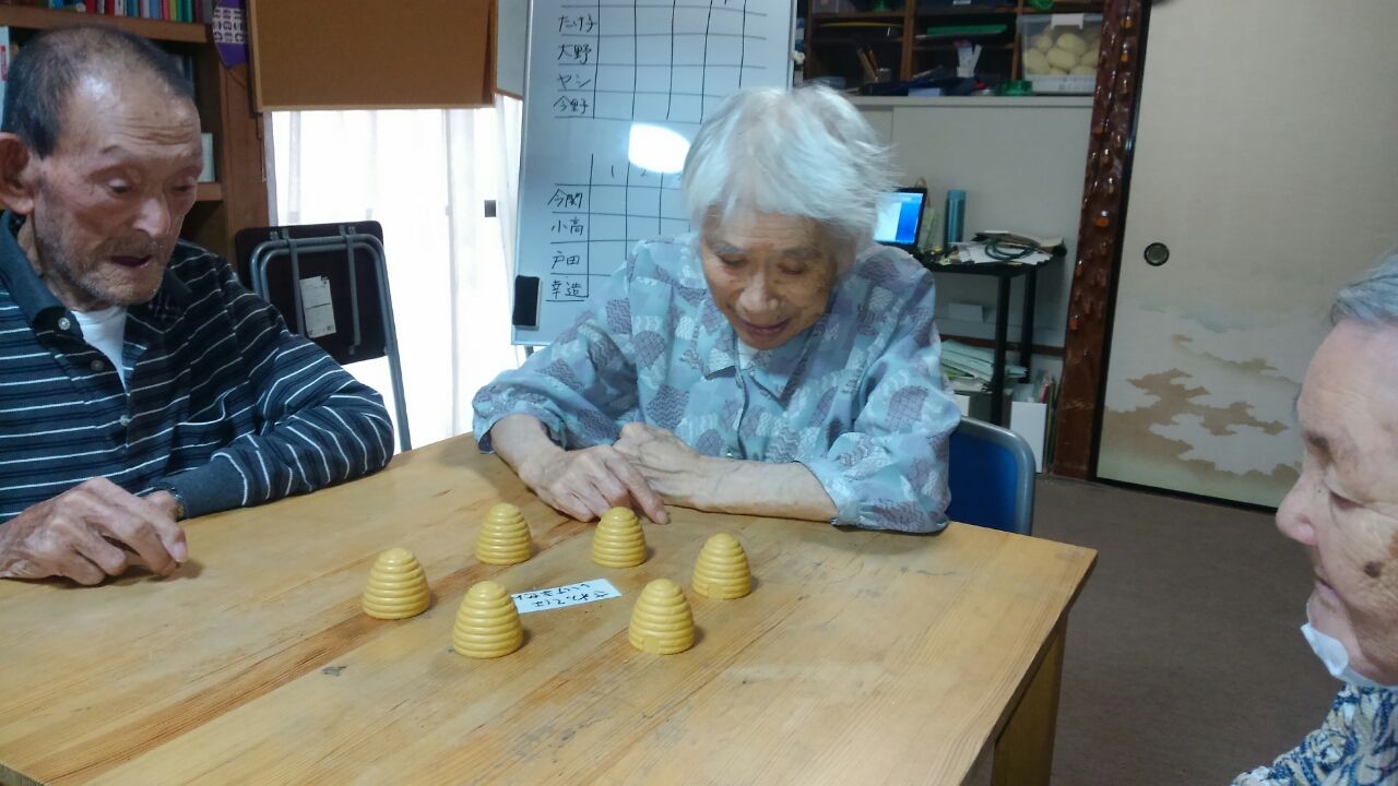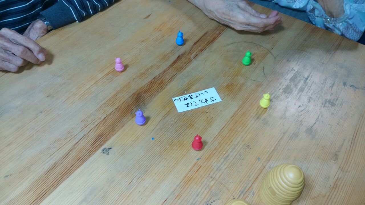 ぶんぶんかくれんぼ。色あつめすごろく 2017.05.31 11:20 記憶のレクレーションで、ぶんぶんかくれんぼをしました。 6色のハチのカードを出しひとりづつ かくれているハチのかぶされている かごを指で差して当てます。4つ当てると 上がりです。 最初のうちは、わからないといいながら 予想で指差ししていましたが、ちょうど 出た色がでて次の人がちゃんと覚えて いられて当てることが出来ましました。 色あつめすごろく 目的の番号に進むのにいろいろな道が あり斜めの道で近道を探すのに苦労 しているようでした。