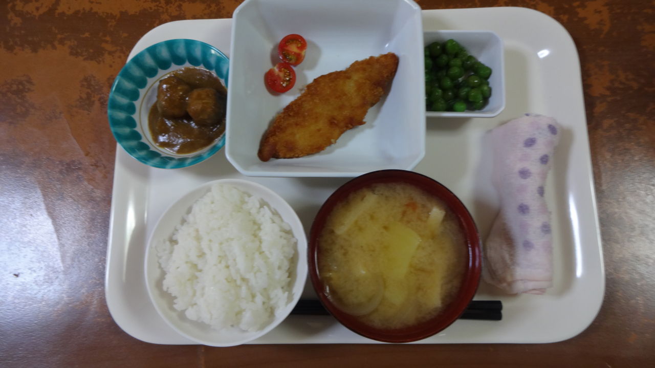 本日のメニュー 2017.06.02 11:16 本日のメニューです(6月2日) 昼食 主食 ごはん 味噌汁 主菜 白菜と豚バラのくたくた煮 副菜 冷奴 添え物 菜の花ちらし夕食 主食 ごはん 味噌汁主菜 白身フライ副菜 肉団子のチーズカレー煮 うぐいす豆