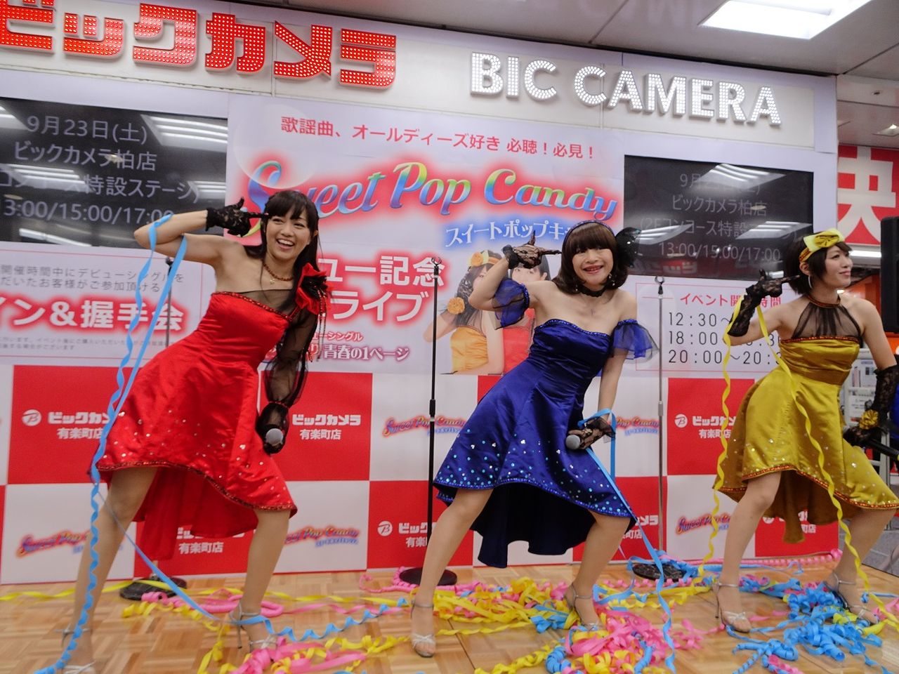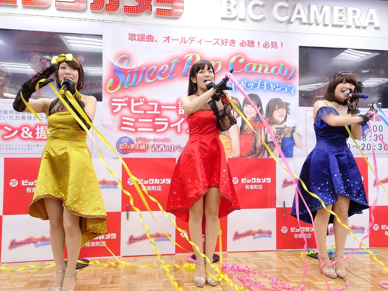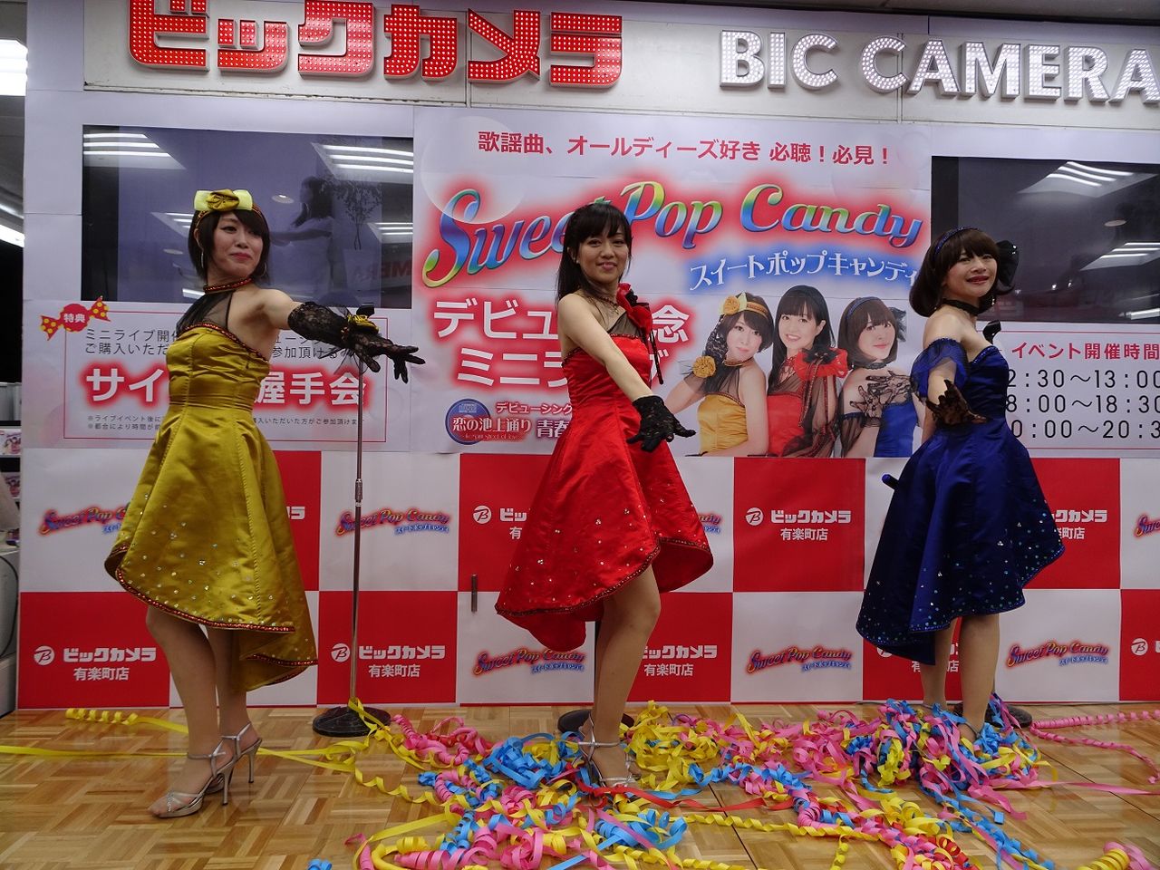 ビックカメラ有楽町店さんでのスイートポップキャンディのデビュー記念ミニライブ。この日は12:30、18:00、20:00の3回ステージ。