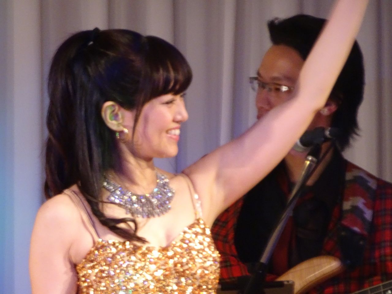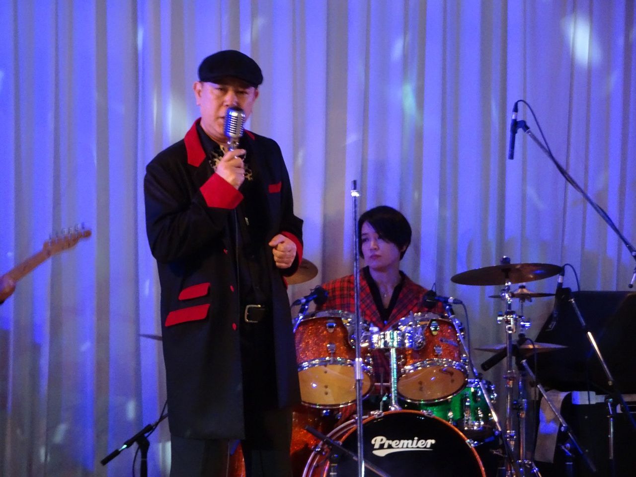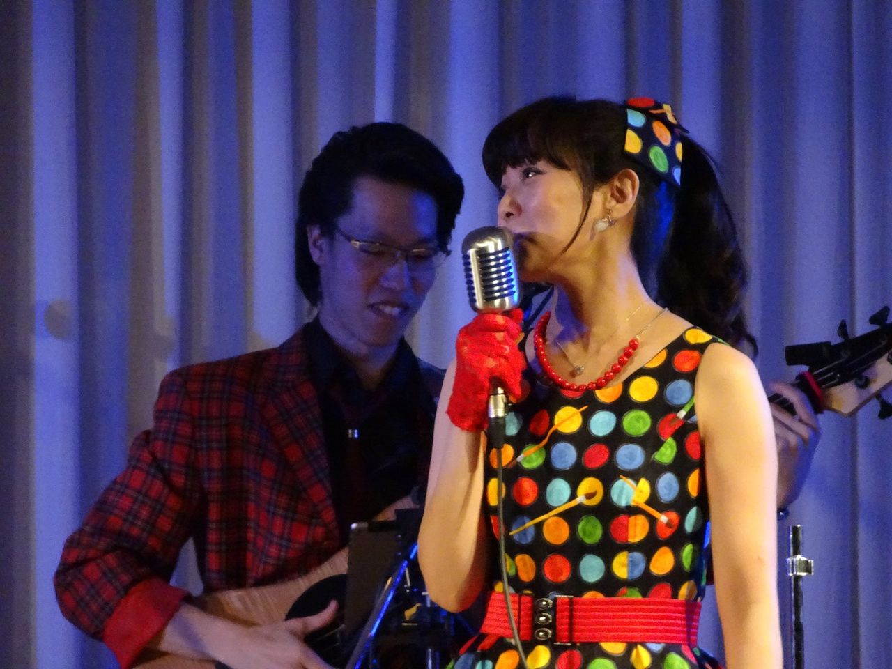 4曲目「恋はみんなのもの」。 イントロがかかった瞬間、もうここは行くしかない!とカメラをテーブルの上に放り出して前へ。すでにKやんさんが最前列を確保されていたので、お隣に。恵比寿組でツートップが完成。最後までこのツートップは最前列を誰にも譲りませんでした。後ろの方のお客さんからどんな目で見られていようが、こいつら邪魔だなあと思われていたかもしれませんが、もうこうなってしまえばそんなことは知ったことでありません(キッパリ)。