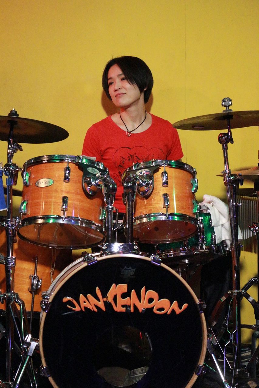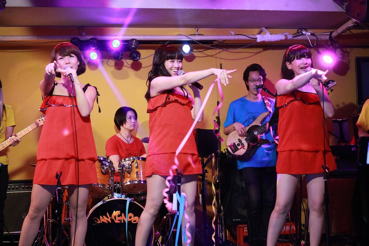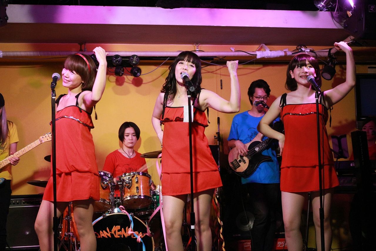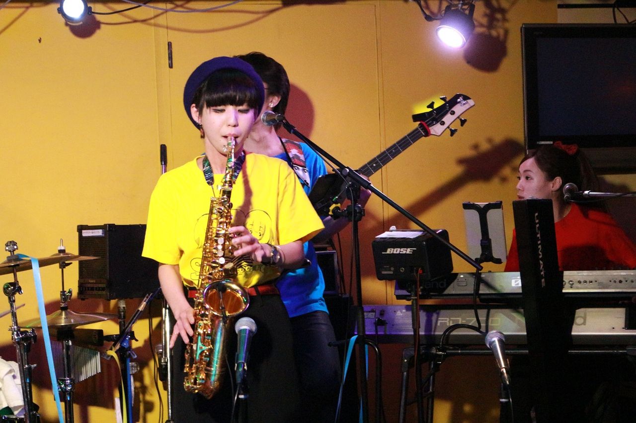 この日のバンドはスイートポップソーダ。ギターはゴンちゃん、ドラムはセンナさん、ベースはシンシン、キーボードはみぽんぬちゃん、そしてサックスに亜美ちゃん。全員お揃いのスイキャンのTシャツ。