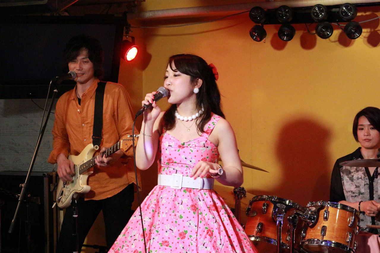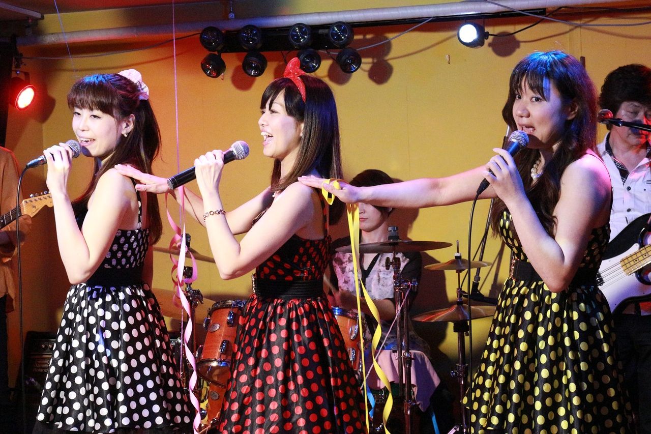 まず、ゑびすキャンディーズのミキちゃん役の美姫ちゃんと、Honey Candy Trappers (ハニキャン)のランちゃん役のMANAMIさん、スーちゃん役YUKAさんのコラボで、「わな」。お客さんからのリクエストで直前に「わな」に決まったそうで、大慌ての美姫ちゃんでしたが、恵比寿代表として頑張りました。後で美姫ちゃんに訊いたら、ハニキャンの2人はコーラスがしっかりしていてとても歌いやすかった、そうです。