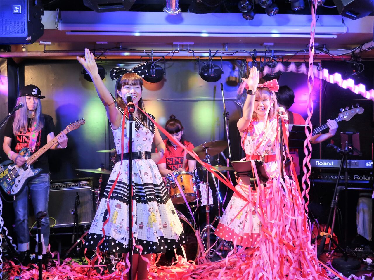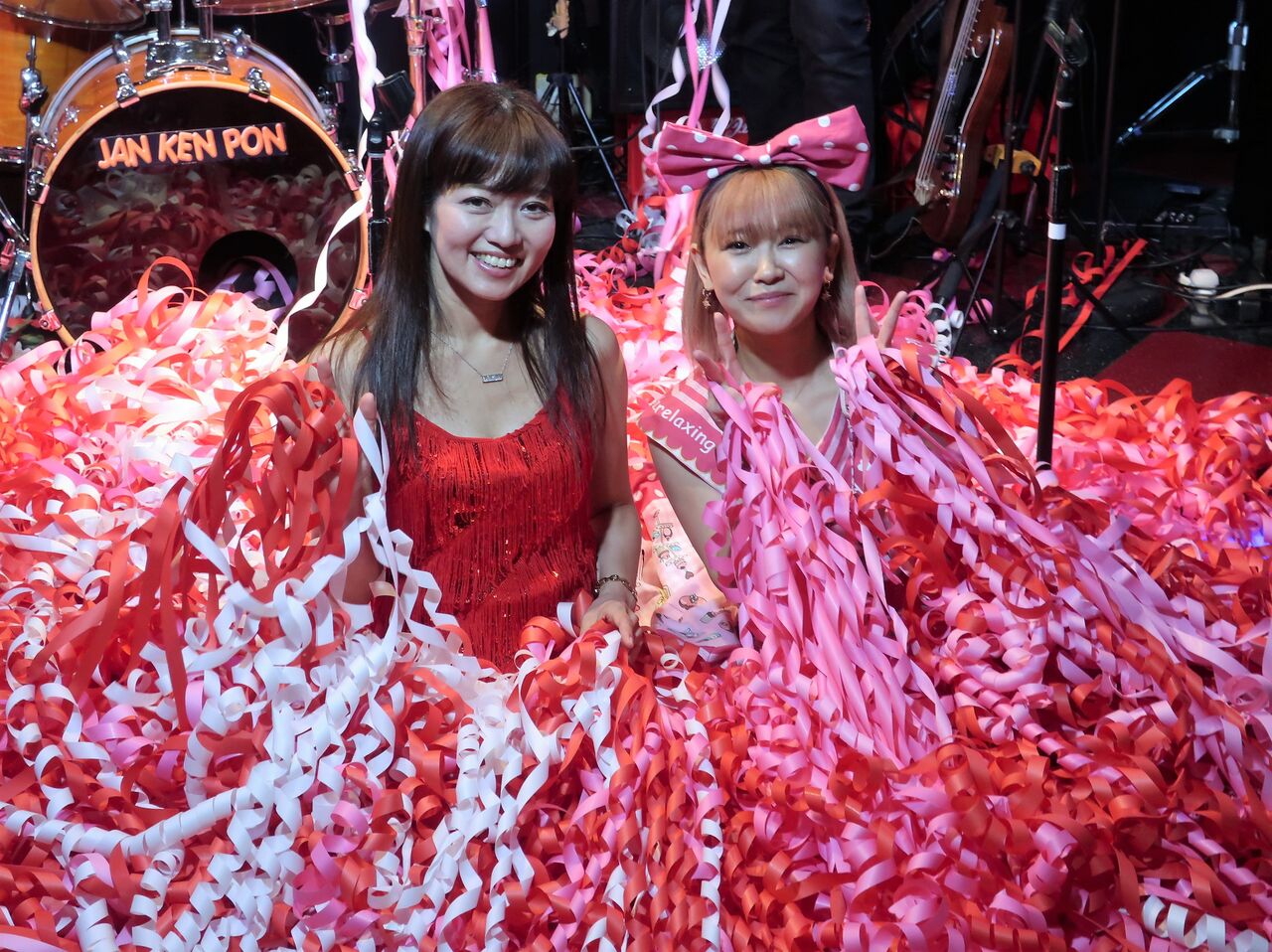 バースデーお祝いのステージでは、赤・ピンク・白のみの紙テープで綾香さんとナンスィさんをお祝い。見事な「いちごミルク」のミルフィ~湯♨ができあがり!