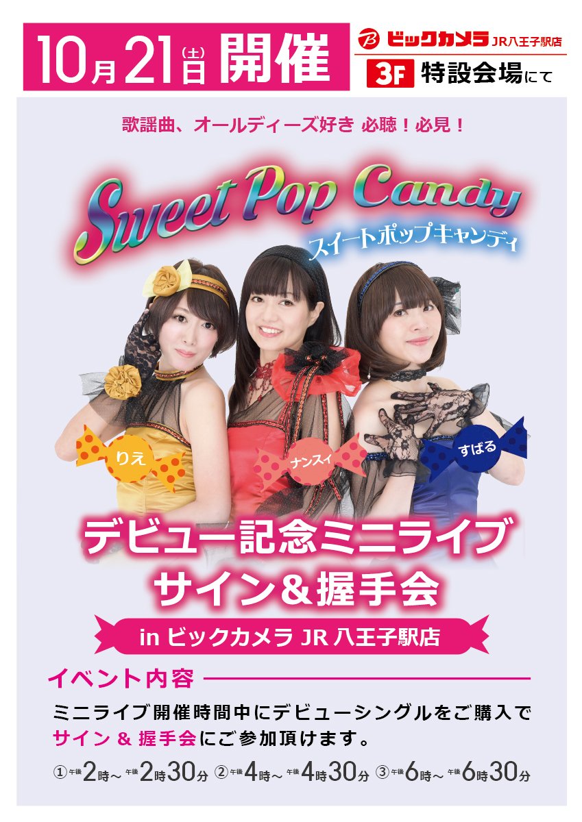 いよいよ、今日10/21(土)スイートポップキャンディが「ビックカメラJR八王子駅店」さんでライブします。3F店内特設ステージで14時/16時/18時の3回ステージです。