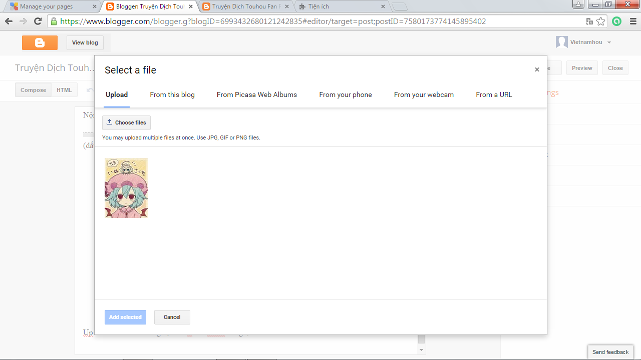 Cậu vào blogger.com, dùng cái account tớ đưa nhé. Sau khi vào thì có 2 blog: Truyện Dịch Touhou Fan Forum và Touhou Fanmade, thì Truyện dịch là cái đang dùng. Touhou Fanmade là bản thử nghiệm hồi đầu.