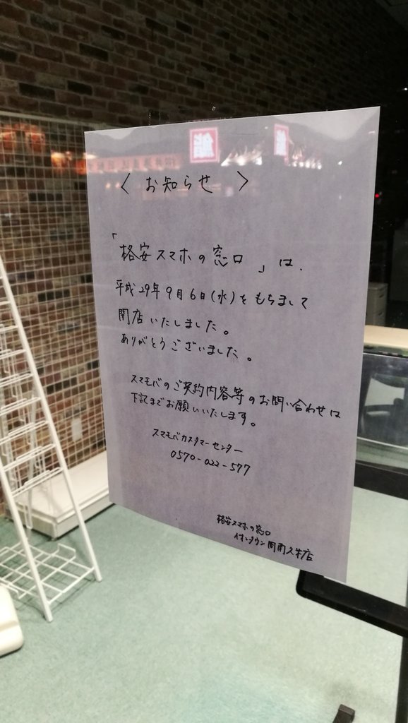 やっぱり厳しいっすよね…… 2017.10.04 10:52 イオンタウン周南久米に久しぶりに寄りまして。で、見てみるとここの「格安スマホの窓口」、閉店されてたんですね。 一度お話を伺ったことはありましたがすごく良心的で、ワタシが話した感じでは無理強いする感じは無かったんですが、やはりそれでは難しかったんですかねぇ……。それとも3大キャリアから乗り換える方、ってのは少なかったんですかねぇ……。ま、大手のサブキャリアも家電量販店などで売ってたりしますし、大変だったのかも知れませんね。