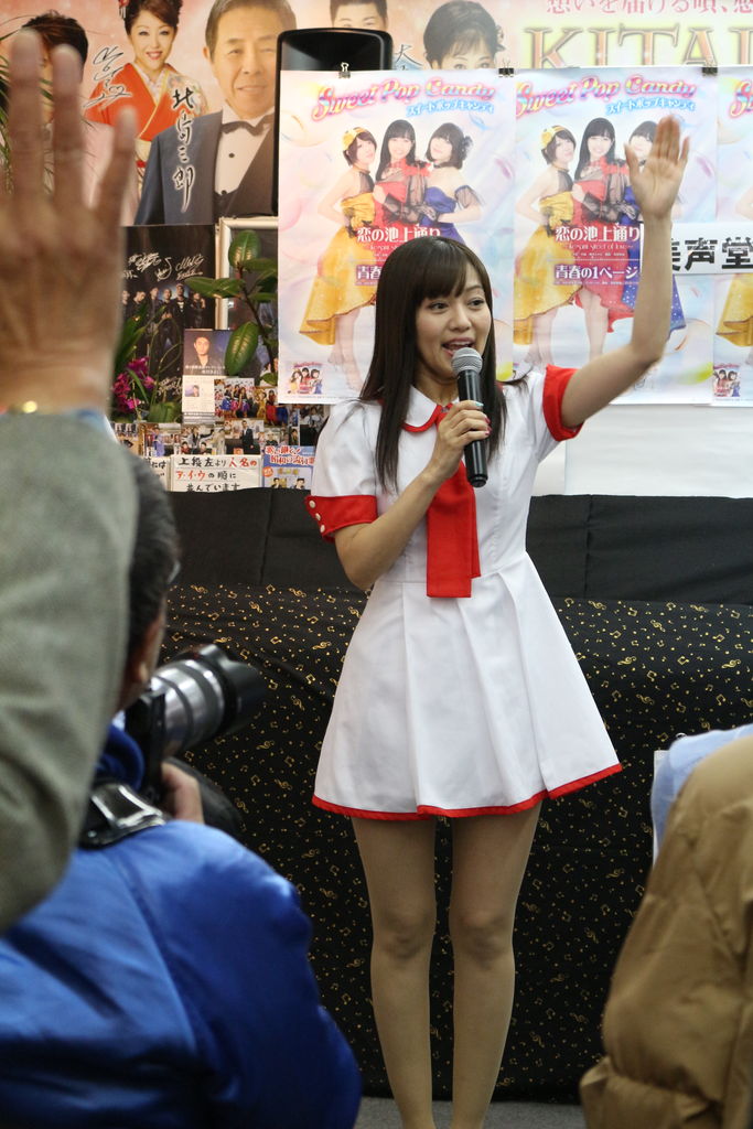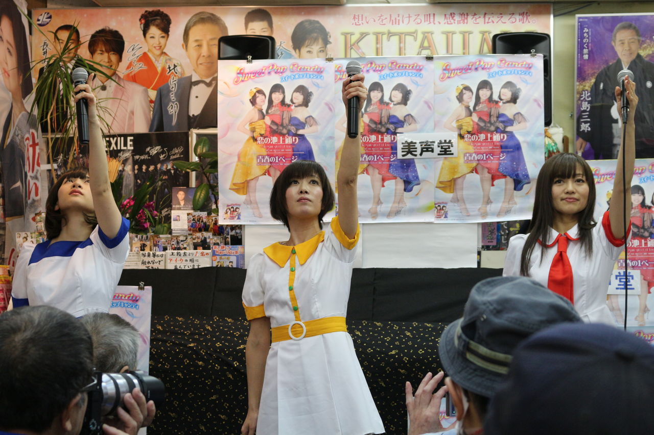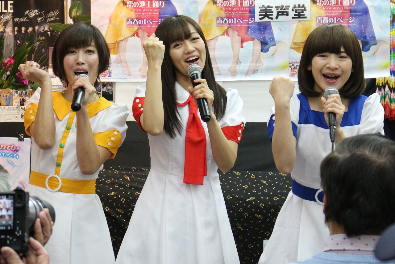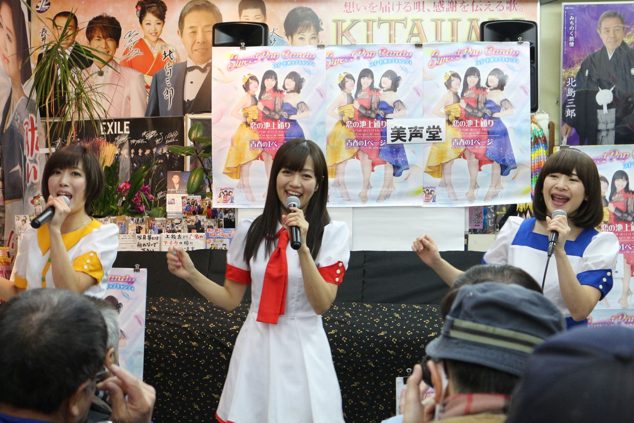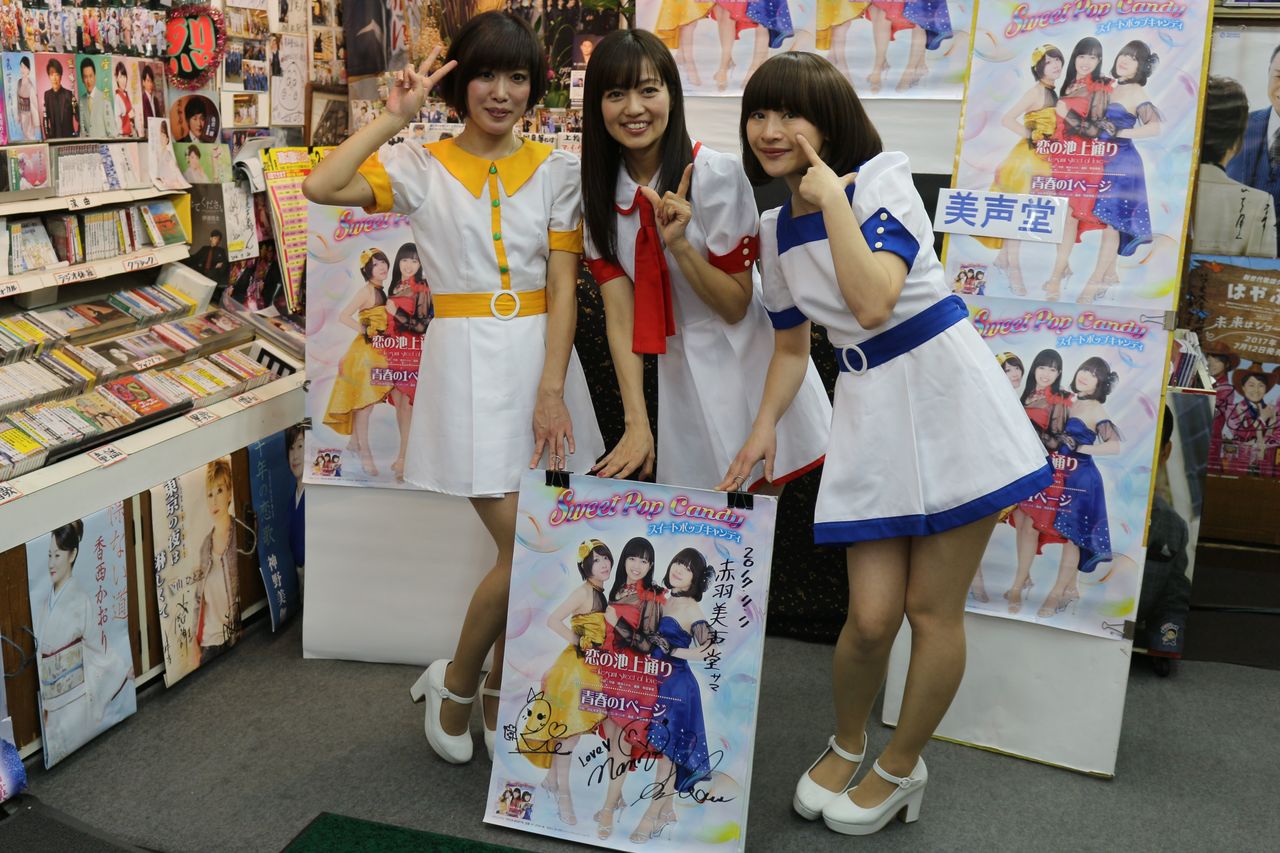 昨年の8/7、9/20、11/11に引き続き4回目の赤羽・美声堂さんでのキャンペーンライブ。お客さんの中には4回とも観に来ていらっしゃる皆勤賞の常連さんもいらっしゃり、スイートポップキャンディのお三人もさぞかし心強いことでしょう。