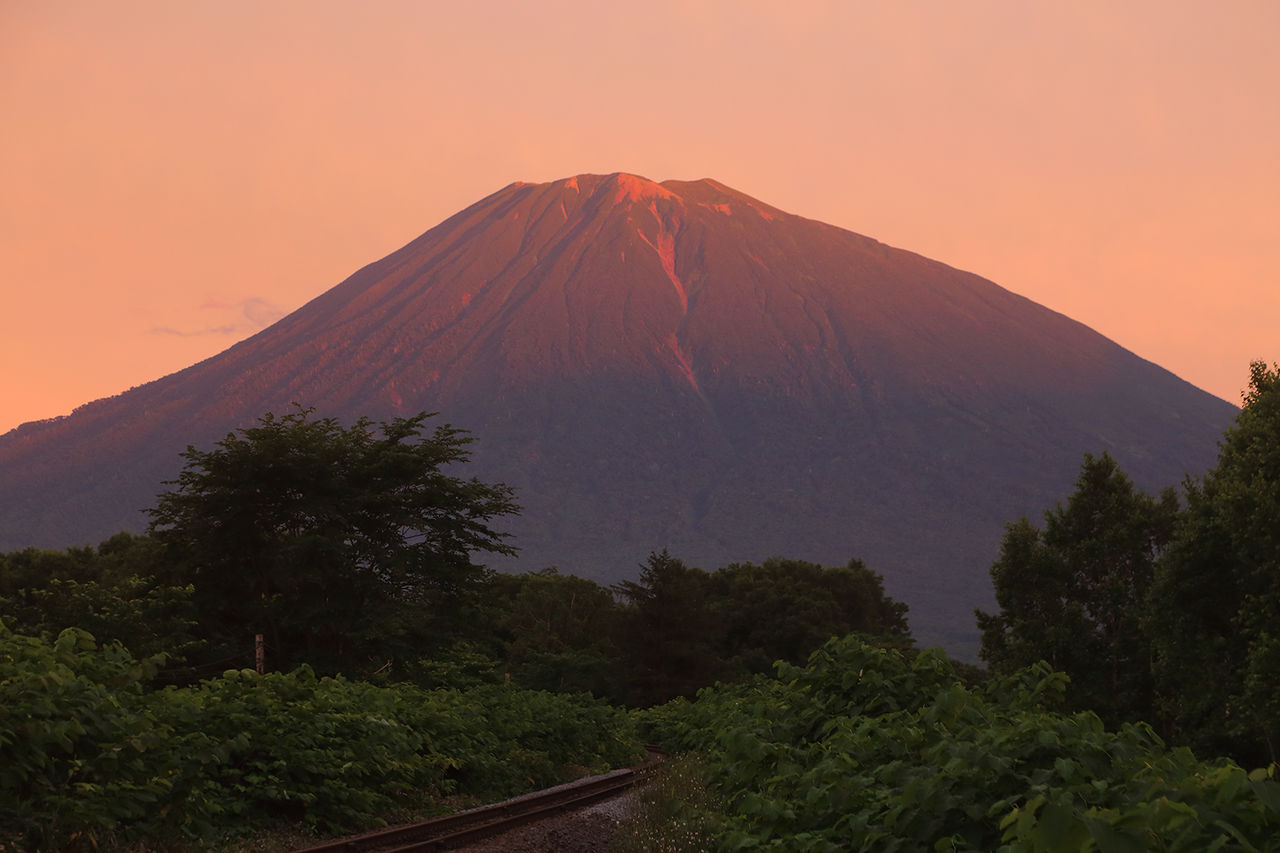 お天気は最高。赤く染まる夏の羊蹄山。夕焼け色が残るタイミングで小樽行きが通過しました。