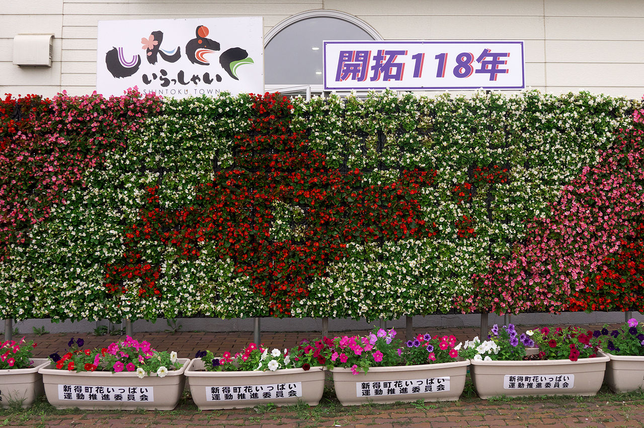 新得駅に着きました。花で作った北海道地図。真ん中の白は、そば処