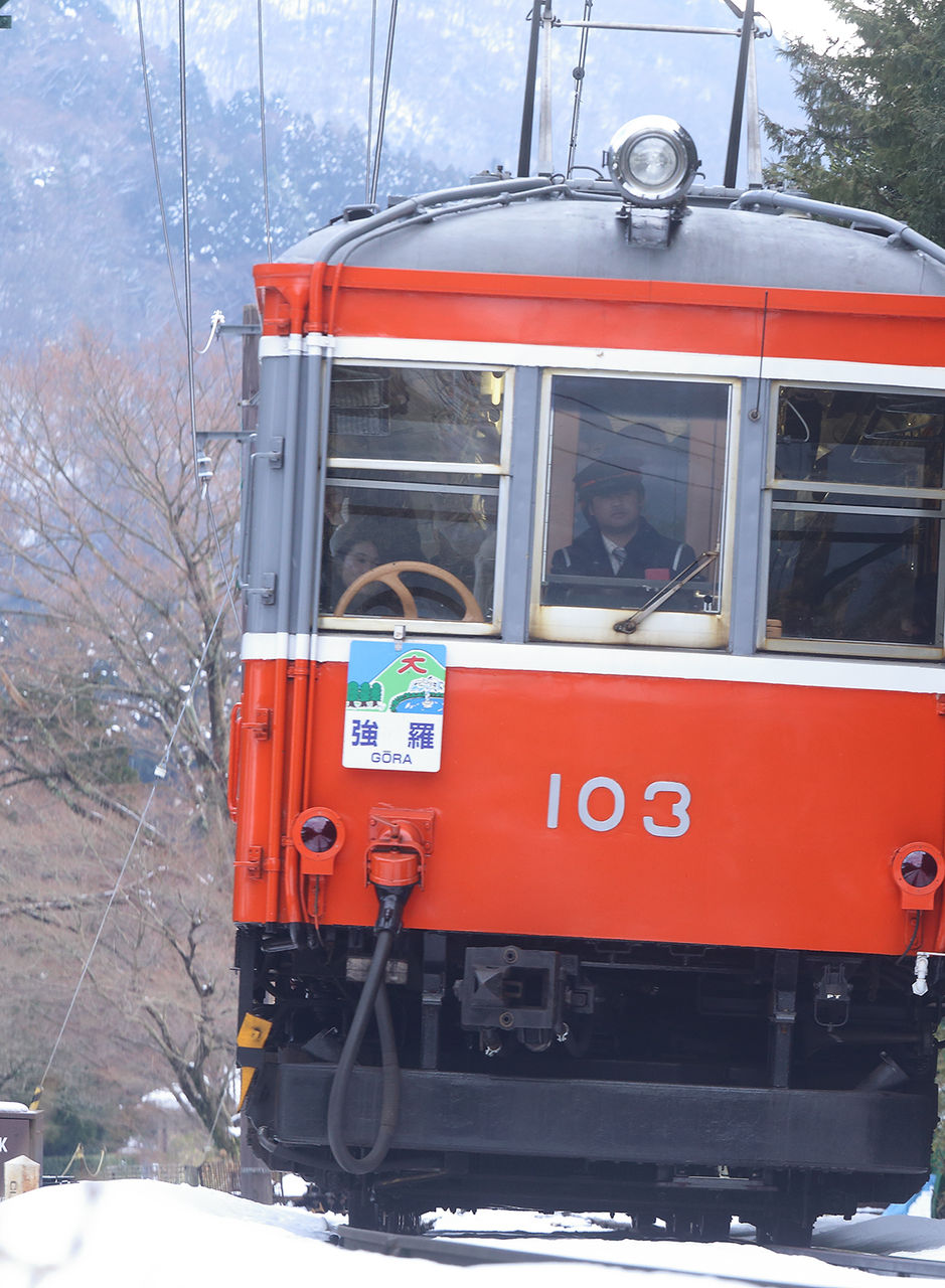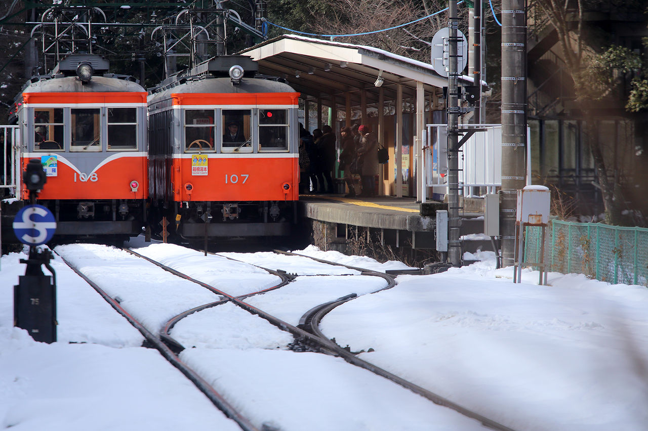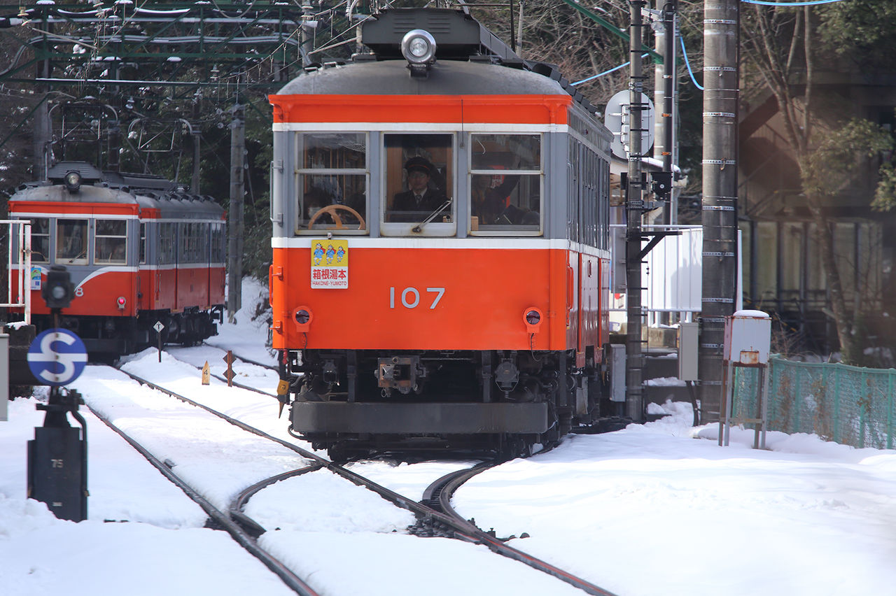 前回降りなかった小涌谷で下車。いつも行く俯瞰場所に向かう途中、猪と遭遇。こんなのに突進されたらたまらんと駅に戻ったところ、旧型同士の交換が見られました。