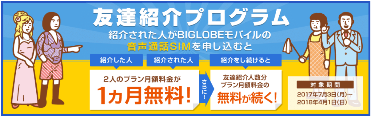 BIGLOBEの音声SIMを知人に紹介すると1ヶ月のプラン月額料金が紹介した人もされた人も割引!