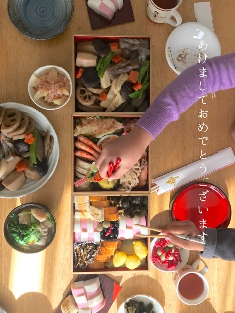 昨日は、New Years cards 1つ目の作り方について書きました。もう一つのブログにアップしたのは、おせちの写真です。元旦当日、何かお正月らしい写真を撮影して、カードを作ろうと思って実家へ向かいました。実家につくと、毎年恒例我が家のおせちを9人家族で食べる年初め準備が完了していました。南側の窓から光が差し込み、おせちをきらきらと照らしていました。いつものようにおせちの写真を撮影。最初、普通に撮影していたのですが、突然閃いて真上から撮影してみることに。角度を変えて気づいたのは、どこかのデパートで買ってきたものに間違われそうなくらいきちんと並べられていたことです。そこで、ゆめちゃんとことちゃんの手を入れることを思いつきました。ことちゃんが、5歳の小さな手でお箸があまりうまく持てていないところもいいなと。南の窓から、お雑煮へ光が当たっているのもポイントで、冬の高度の低い太陽の表現です。お箸の袋「寿」も、隠れないように配慮しています。それで、こちらの写真となりました。