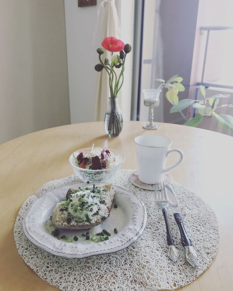 今朝起きて、土曜日なのでルーティンメンテにしている、部屋全体清掃&フローリング水拭きを終わらせてから、私もブレックファーストセレモニーをすることにしました。ポーチドエッグは、電子レンジでできるバージョンで、ずるしましたが。(笑)こちら。