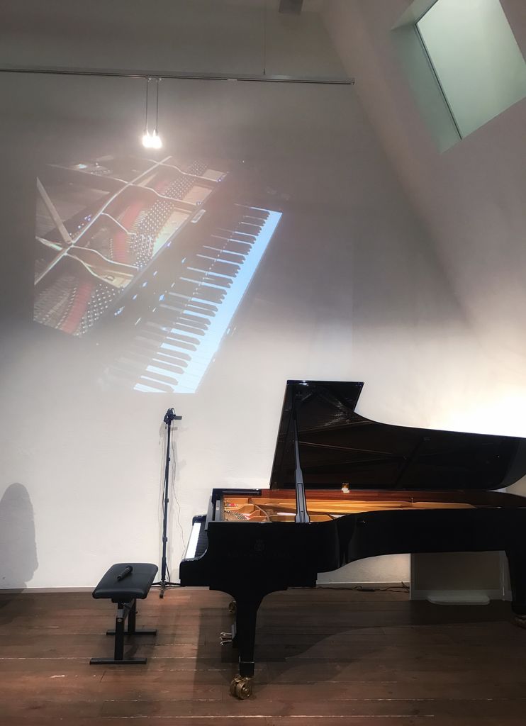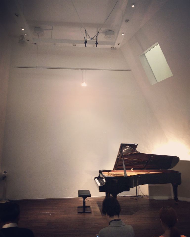 それよりなによりも驚いたのは、今回、ピアニストの弾いている様子を真上から撮影した映像が、白い壁に投影されていたということです。前半は、意図して目を閉じて聴いていたのですが、後半はプロジェクター投影されているのでそれを観ることにしたのです。