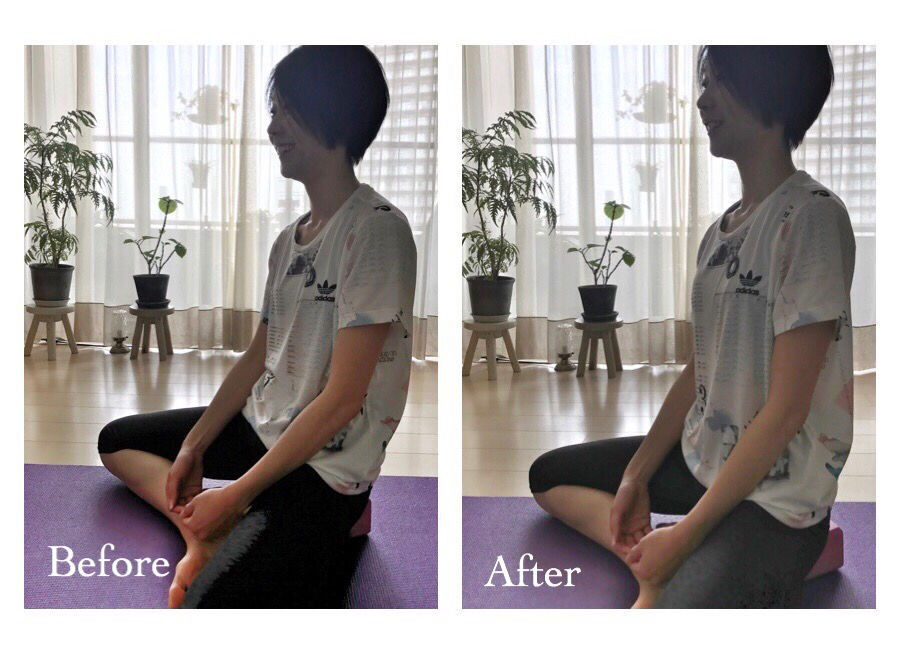 60分ひたすら股関節を縮ませたり、伸ばしたりの両方の動きをやりました。そうしたら、座り方が全く変わりました! 写真は終わった後に撮影したので、Beforeの写真のほうは、演技になっていますが、本当にこんな感じで座っていたそうです。