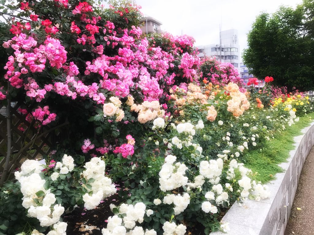 「じゃ、歩きますか!」ということで、結局向ヶ丘遊園駅から15分ばかり歩いていくことになりました。いろいろとたらい回しのようなことがここまで起きましたが、これも何かの調整があるなと思いつつ歩いていくと、川沿いに夢のような「薔薇園」を発見しました! これが待っていたか!!!