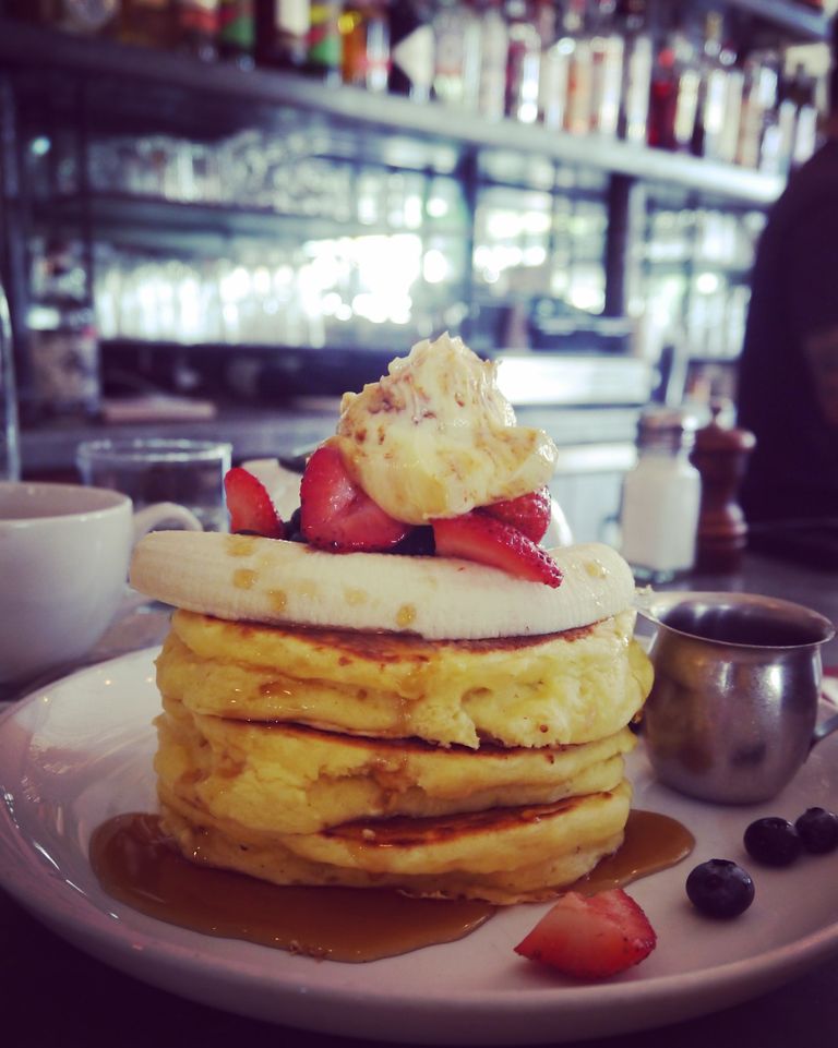 ジャーン! 3段仕立て。上にのっているのはアイスではありません! バタークリームにシロップ的な甘さのものが混ぜてあります。バナナは1本を半分にした感じで、1段目、2段目の中にも入っていました。イチゴにブルーベリー。さて、どんなリコッタなのでしょうか? Billsの物と比べてみると、こちらは非常にもっちりな感じ。どちらかというととろける感じはなくて濃縮されているような舌触りです。アメリカンなパンケーキです。美味しくいただきました。