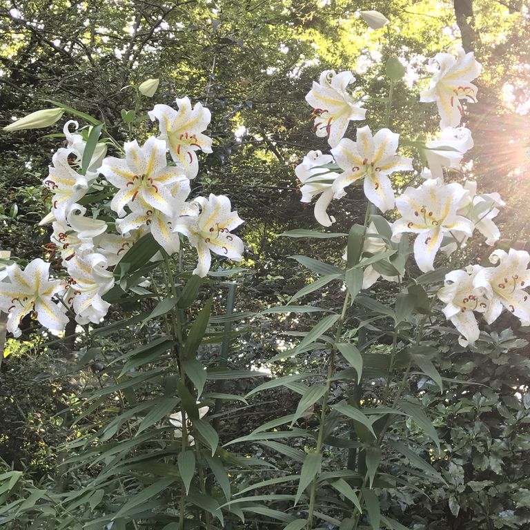 参道の終わりのほうに、急に百合が見えました。こんなに咲き誇っている様は、東京人として滅多に見ることができないので、見頃に出逢えたことにハッとします。