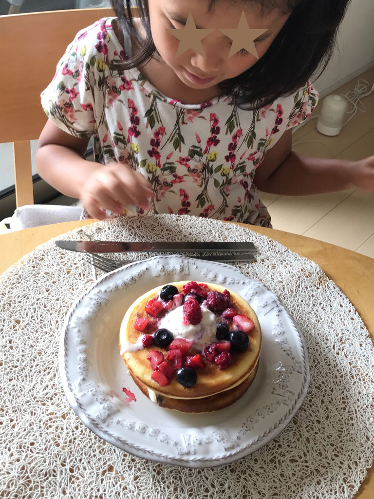 ことちゃんは、パンケーキを作るのも手伝ってくれました。ゆめちゃんは、焼くときに登場。(笑)焼けたパンケーキのデコレーションはそれぞれが担当です。ことちゃんは、5歳のわりにセンス良くデコレーションできたのでびっくりでした。たぶんビジュアルで覚えていることが得意な方なのかもしれませんね。