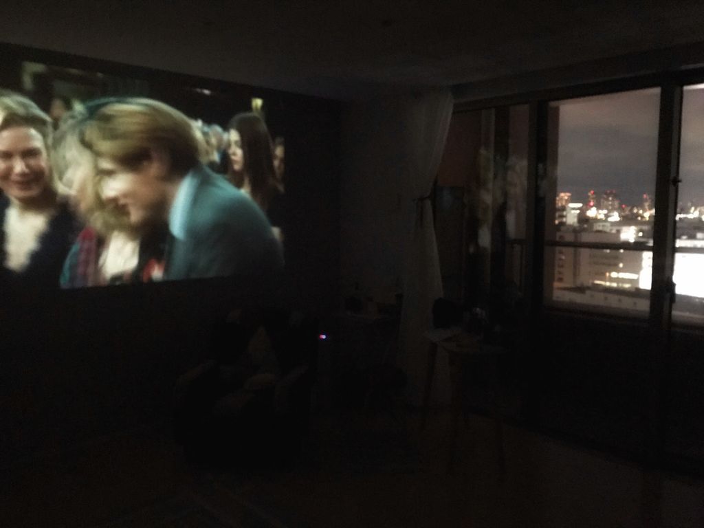 お寿司を食べながら『Before Sunrize』上映。私の部屋よりも壁が大きく使えるので、小ぢんまりとした映画館並みのスクリーン面積で全員ハイテンションに! 窓の外に夜景も見えていたので、ロマンティック度がMAXになりました。