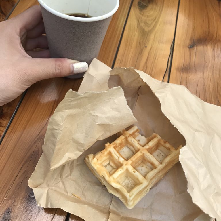 ドリップしたてのコーヒーはとても美味しく、でもスイーツ売ってなかったなぁと少し思っていると。先程のスタッフさんが私のところにやってきて、「先程はすみませんでした。ワッフル1つ残っていたので、こちらどうぞ!」と言って、くださったのです。(写真はだいぶ食べてしまい残25%です)