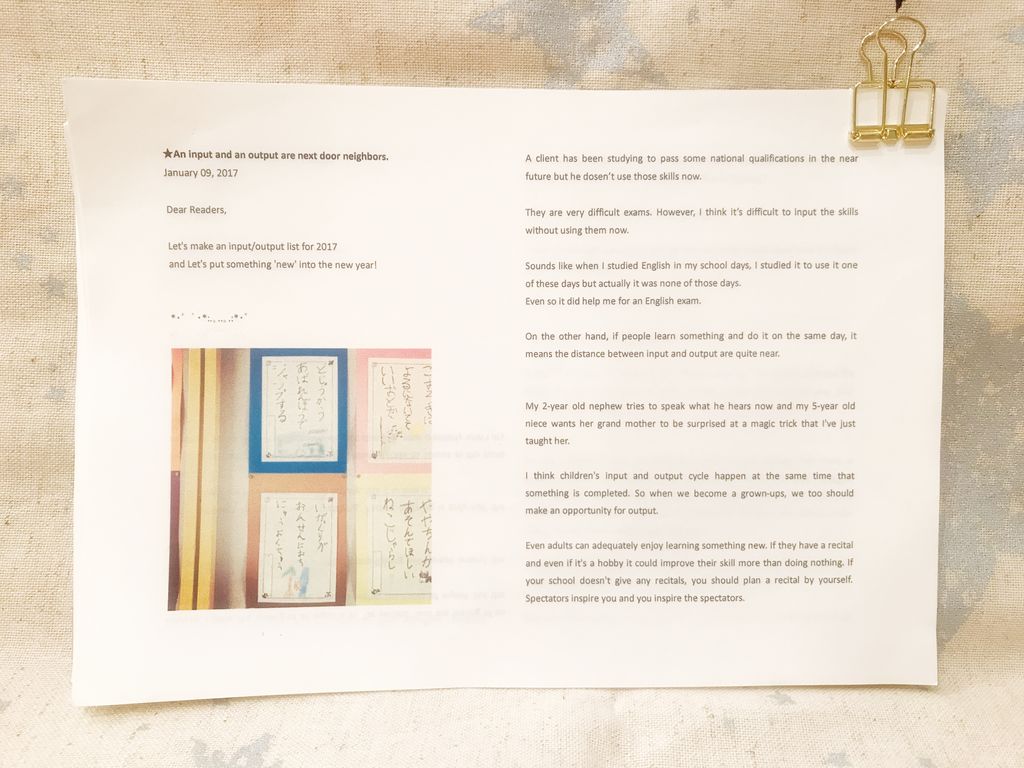話の流れで、昨日英会話の先生に印刷して持参した過去メルマガの冊子をそのクライアントさんにお見せすると、「オシャレですね~。このクリップかわいい! ネット上だと便利だけど味気ないものになるから、こういうのいいですね~」と感想をいただきました。