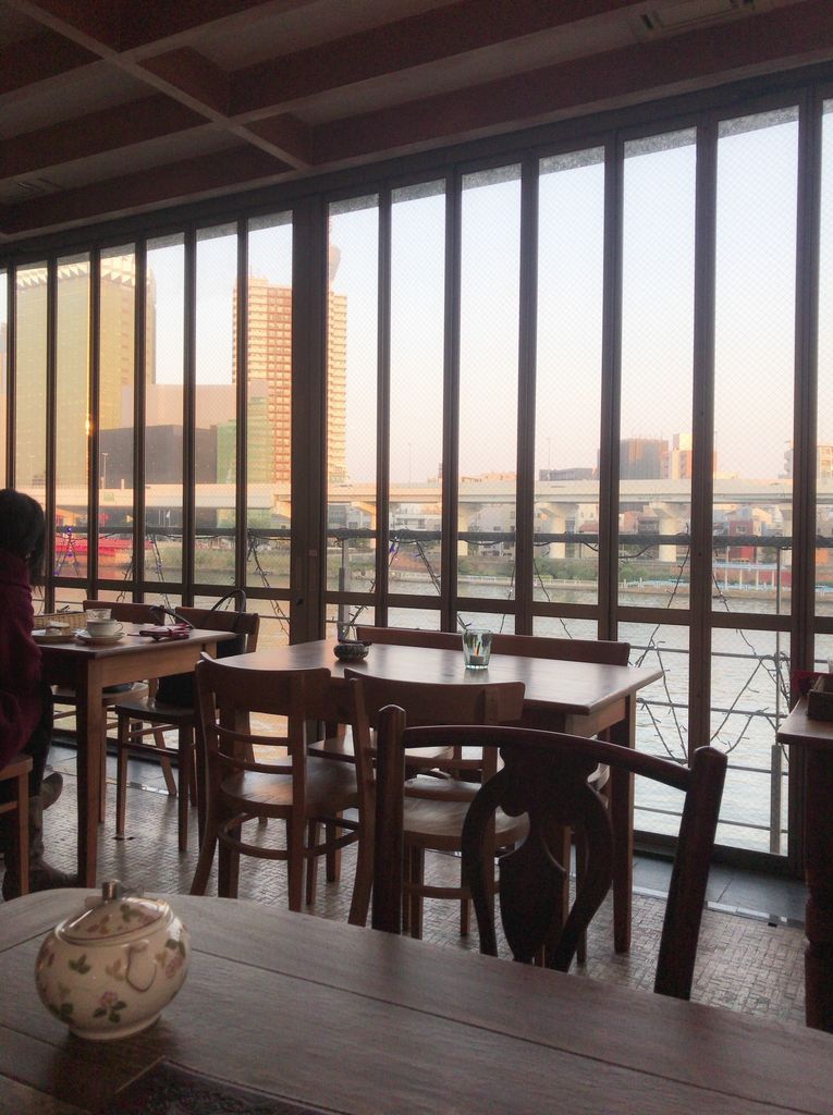 この写真は窓が閉められてますが、来たときは解放されていて、目の前には隅田川、スカイツリーという絶景! セーヌ川と言っても過言ではありません。(笑) 探してよかった!!!!お茶もしてないのに、「また来たいね!」とみんなで話していました。