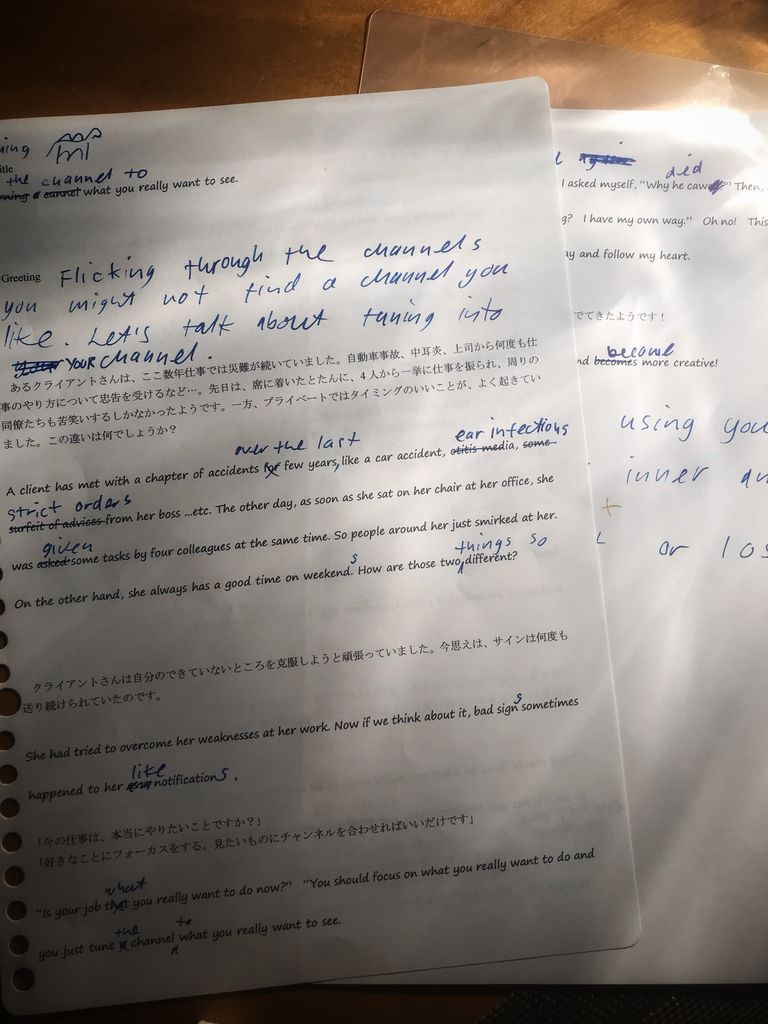 いつものように英訳の添削をしてもらっていましたが、やっぱりこの先生はさりげなく凄いなと。私も先生がハーモニーしやすいようにと、しっかりと作品を仕上げていくことが大前提ではありますが、さらにハーモニーがよくなるように、タイトルと最初と最後をしっかりと押えてくれるのです。そんなハーモニーができる人が目の前に現れ、毎回スムーズに作品が完成できるというのは、この道を進んでいきなさい、というサインだと感じさせてもらっています。