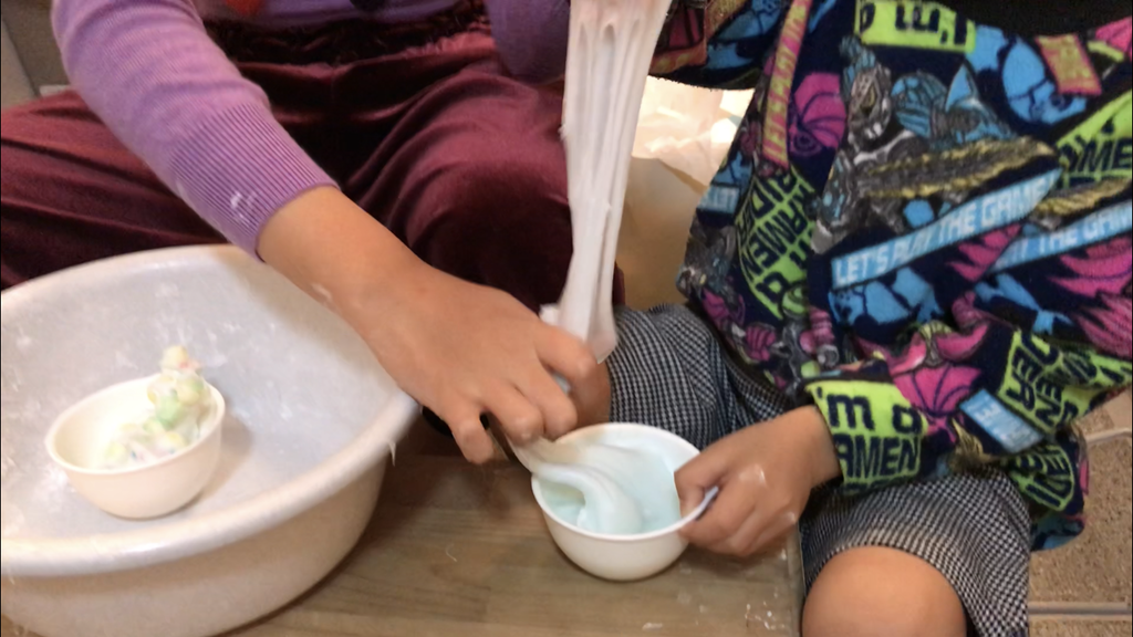 近所のショッピングモールで、おやつにみんなでアイスを食べてから家に戻り、今度は、ゆめちゃんがスライムを作るというので、スライムを作っているYouTubeも作ってあげることにしました。