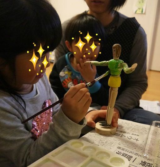 せいちゃんのおもちゃでみんなも一緒に遊ぶことになるだろうと思っていましたが、予定変更。ことちゃんは、クリスマスプレゼントにあげた「デッサン人形」に自分で色を塗ったと言っていたので、本格的に色を塗るために美大出身の妹に手伝ってもらいながら、アクリル絵の具で仕上げることになりました。たまたま、ことちゃんが塗りたいと思っていた色が揃っていたのもすごいです。妹が15本くらい筆を持っているのにも驚きながら、幼稚園児、初アクリル絵の具で木にペイントすることになりました。