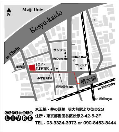 住所:〒156-0043 東京都世田谷区松原2-42-5-2F(京王線・井の頭線明大前駅徒歩2分)TEL: 03-3324-3973メール:cafebarlivre@gmail.comTwitter(@livre_zono)https://twitter.com/#!/livre_zonoFacebook(Cafe Bar LIVRE)http://www.facebook.com/pages/Cafe-Bar-Livre/156513524402720iFLYER(Cafe Bar LIVRE)http://iflyer.tv/ja/cafebarlivreLINE@(Cafe Bar LIVRE)http://line.me/ti/p/%40hin7450tリンクから飛べない場合は「LINE」で「LINEグルメ予約」→「検索」で「明大前」から出てくると思います。LINE@のQRコードはこちら↓