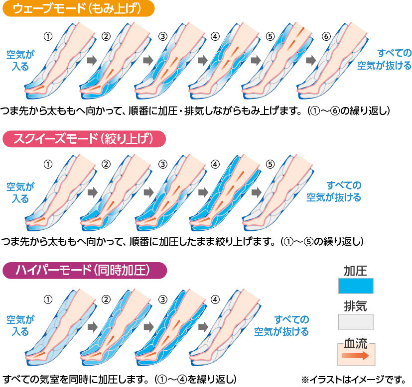 こちらは、脚に装着しているブーツ状の物にエアバッグが入っており、空気を入れることで脚のマッサージを行うものです。(下図メドマー機能イメージ図)