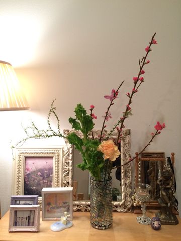 ところが、家に帰って生けてみようと思ったら、一筋縄ではいかず…。桃の枝ぶりや、菜の花の太さ、カーネーションの咲き具合など、適当に選んでいたことに気づかされました。いちおう、「いけばな」を画像検索し、試行錯誤した結果です。それから購入後数時間で、桃の花が開花中!明日は、小原流いけばなの先生もプチセミに参加されるので、生け直してもらいましょう。(笑)