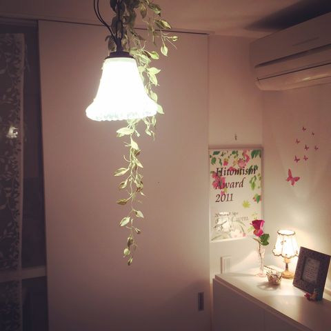 「ここだ!」ベッドの真上に吊るす照明は風水的にNGという情報もあったので、植物を絡ませることで、電磁波(?)回避もできそうです。