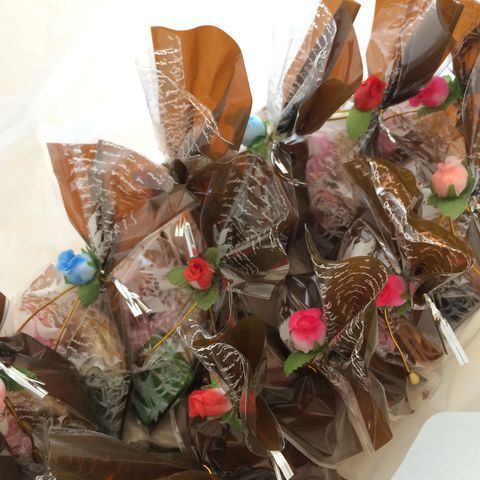 こちらは配るお菓子です。春を意識して、ピンク色包装のキャンディーと花型クッキー、そのほかチョコレート、オシャレ感のある、せんべいをセレクトしています。