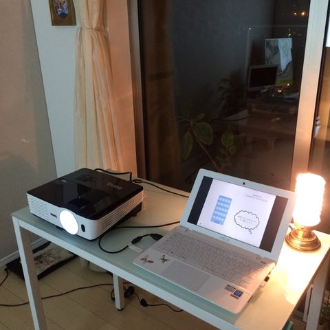 明日のトークイベントの準備のため、今日は大きいほうのプロジェクター投影確認です。こちらのほうは2000ルーメンありますからさすがに明るい!いつも前日にスライドを投影できるほどの余裕がなかったので、自分の思考もかなりシンプルになってきたのだなと感じました。