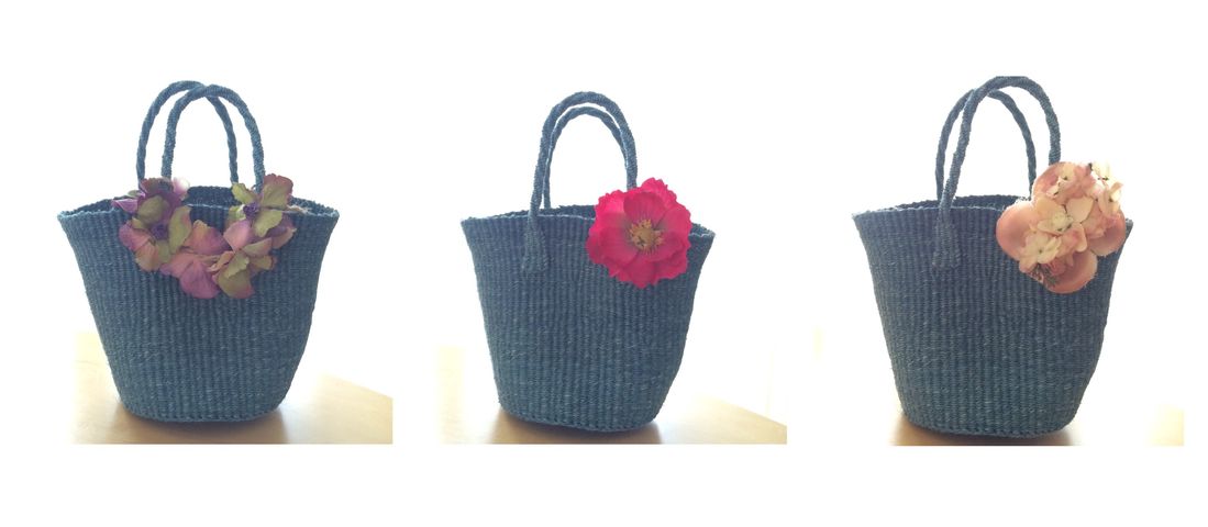 Parisで買った赤いお花のコサージュ、ロンドンで買ったピンク、パープルのコサージュを組み合わせてみました。