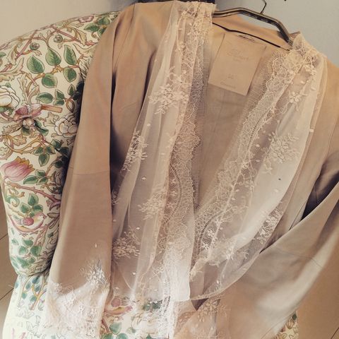 数年前に買った、ヴィンテージレースが繊細すぎるあまり、たまに登場のベージュのレザーJKとコーディネートしたいと思っています。