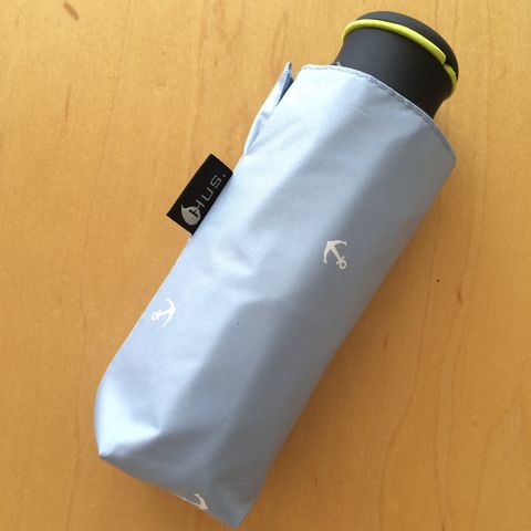 緊急の傘探しのはずが、15分くらい悩んだ挙句、とうとうわたしのお眼鏡にかなったのは、碇モチーフのIce Gray色の傘でした!HUS. Smart mini Parasolです。ちょうどグレーのパーカーを着用していたので、ぴったりでした。UVカット率99%以上の遮光日傘。生地の裏面にPU(ポリウレタン樹脂)コーティング。はっ水加工もされているので雨傘使用できます。折り畳むと約15cmになり、コンパクト・軽量です。