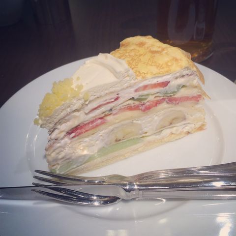 火曜日おやつどきは、「喫茶店ルノアールも行きつけだよ」というようなおじさまが店内に多いことに驚きました。(笑)ちょっと微妙な空気感のなか、フルーツがふんだんにクリームとクレープの中に盛り込まれているミルクレープとアイスアールグレーをオーダー。こんなフルーティーなミルクレープはなかなかお目にかかれません!甘いものを体にチャージして大満足のおやつタイムとなりました。
