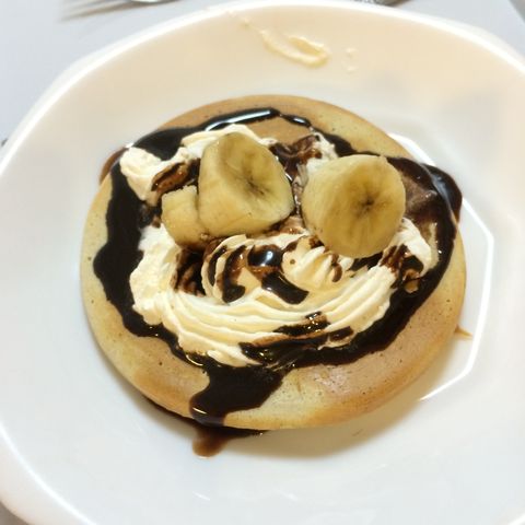 九州パンケーキの弾力と甘くない感じが、生クリームチョコバナナの相性に非常によいです!ゆめちゃんが、パパ、ママのためにデコレーションをしていました。あまりにおいしかったらしく、作った人の特権で、もう半分ずつおかわりです。