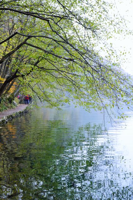 気温10度くらいのマナスイオンハイキング。赤や黄色く色づいた葉とすこしマットなエメラルドグリーンの水、どことなく立ち込める霧とのコンビネーションが美しい。水量ぎりぎりの足元を注意しながら、木でできた道をただただ前に進んでいきます。戻れない程、次々と人も流れていきます。