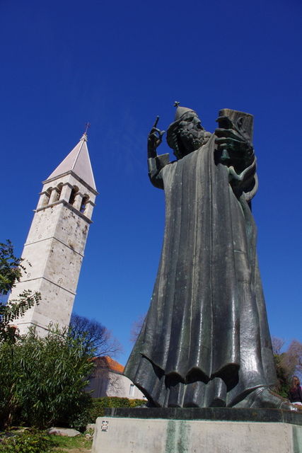 クロアチア世界遺産の旅7日目は、アドリア海沿岸のトロギール・スプリット・シベニクを一気に巡ります。今日のガイドさん、スキンヘッドに、レザーJK、スカートの組み合わせで、モデルさんのようです!